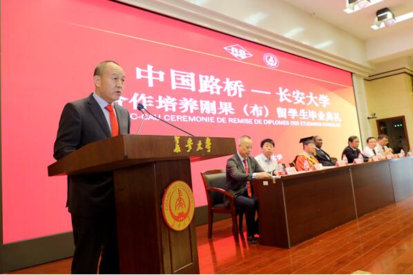 刘靖伯副总经理在毕业典礼上发言指出,中国路桥作为“一带一路”倡议的重要实施者,在致力于实现基础设施联通的同时,重视民心相通,坚持“授人以渔”。截至目前,已资助7个驻在国家三百多名留学生来中国高校进行土木工程、道桥、铁路等专业本、硕学习,其中刚果(布)有101名留学生到长安大学学习,占公司资助留学生总数的三分之一。他指出,校企合作培养留学生不仅为项目驻在国培养基础设施建设领域人才,还能让留学生感受中国的发展,发挥好“桥梁纽带”作用,成为在全球范围内传播友谊的使者。